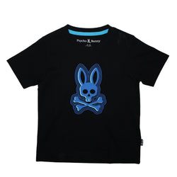 Playera de manga corta para niño, en color negro, con logo clásico de conejo y calavera en tono azul con detalles en negro. Estilo llamativo y moderno, ideal para un look casual con personalidad.