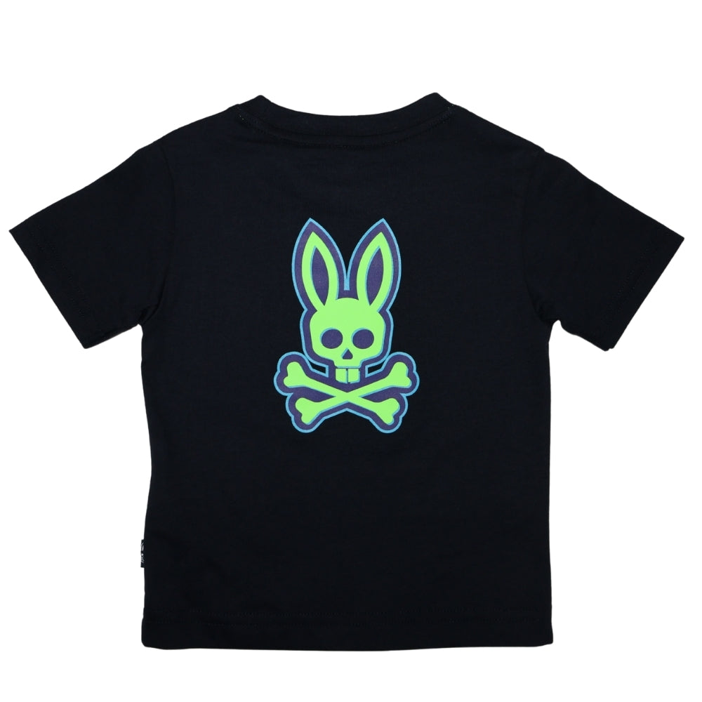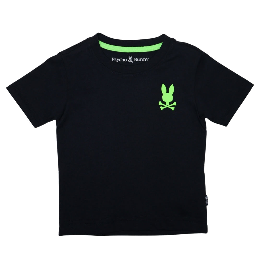Playera de manga corta para niño, en color negro, con logo pequeño de conejo y calavera en verde neón al frente y estampado grande en la parte trasera en los mismos tonos. Estilo moderno y llamativo, perfecto para un look juvenil.