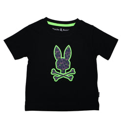 Playera de manga corta para niño, en color negro, con logo clásico de conejo y calavera delineado en verde neón y relleno con estampado en tonos morados y rosas. Diseño moderno y llamativo, ideal para un look casual con estilo.