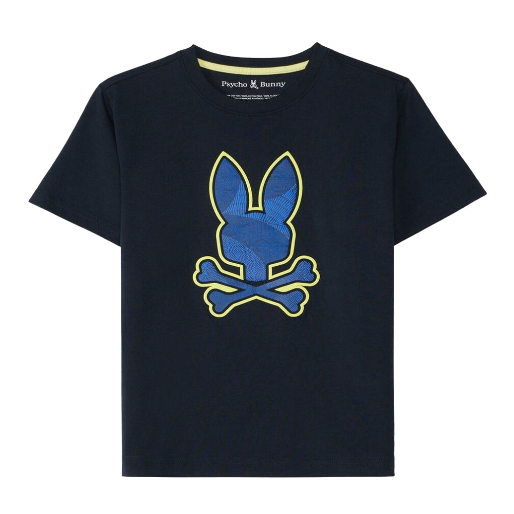 Psycho Bunny playera negra con estampado azul y amarillo de conejo y calavera
