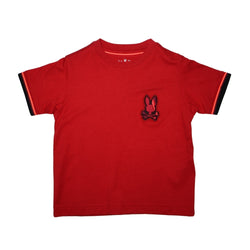 Camiseta de manga corta en color rojo, confeccionada en algodón suave y resistente. Incluye un pequeño estampado bordado en el pecho con el conejo y calavera en tono rojo oscuro, además de detalles en contraste en las mangas. Diseño de corte clásico con cuello redondo, perfecta para un look casual con estilo distintivo.