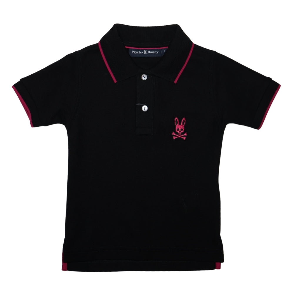 Polo de manga corta en color negro, confeccionado en algodón de alta calidad. Incluye bordado pequeño en el pecho con el icónico conejo y calavera en tono rosa, además de detalles en las mangas y cuello con ribetes en contraste del mismo color. Cuenta con cuello tipo polo y cierre de dos botones. Ideal para un look casual con un toque elegante y distintivo.
