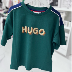 Playera para niño de la marca Hugo, en tono verde oscuro con logotipo frontal en estilo retro multicolor que le da un toque original. Detalles en azul marino y blanco sobre los hombros para un contraste moderno. Ideal para niños con actitud y estilo, perfecta para combinar con jeans o bermudas.
